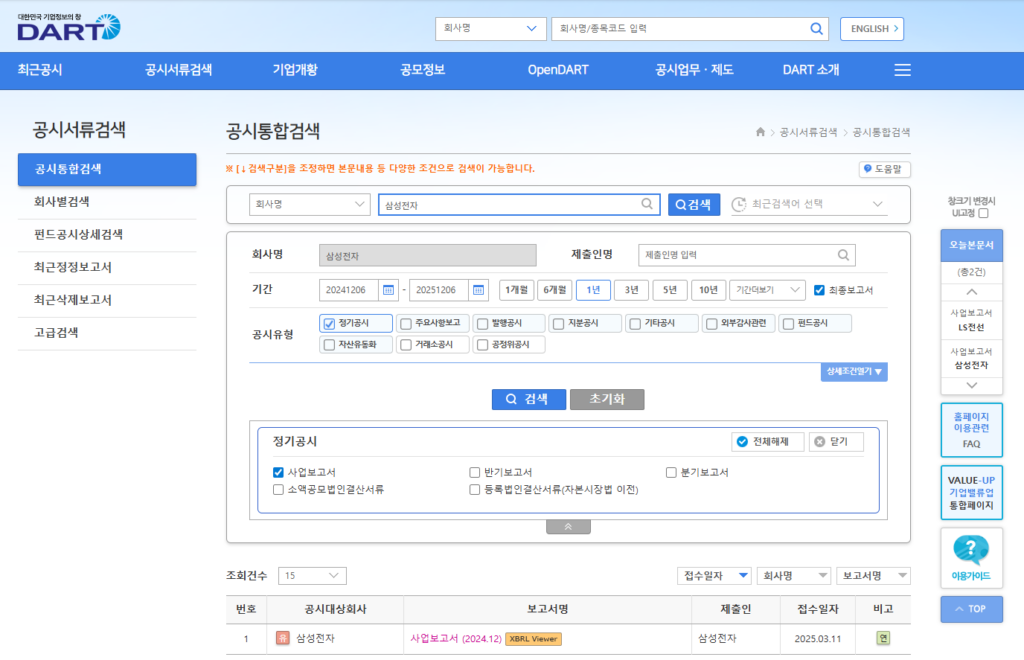 예를 들어 삼성전자의 25년 사업보고서를 DART에서 검색해보자.