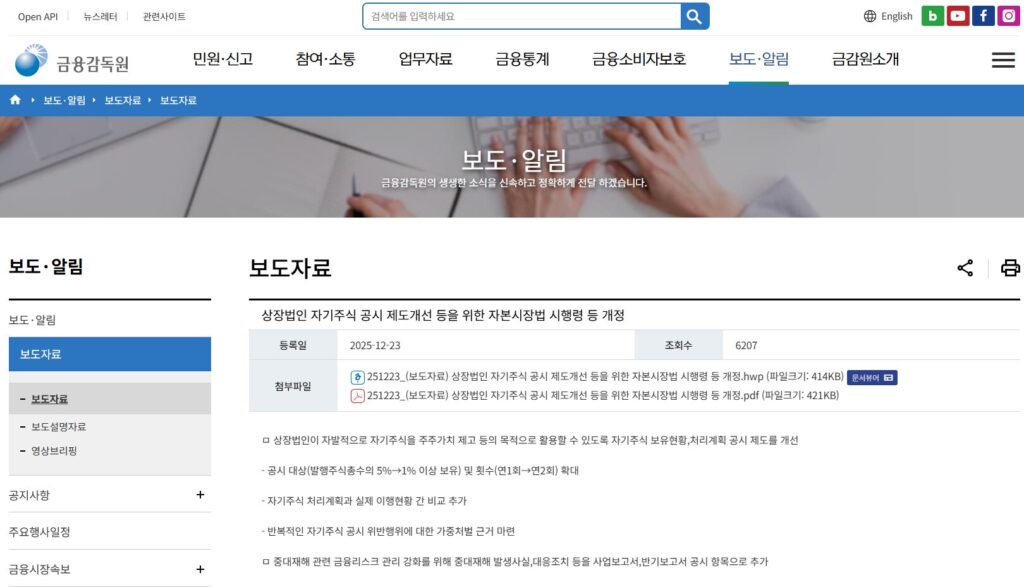 [2025.12.23.금감원보도자료] 상장법인 자기주식 공시 강화 위한 자본시장법 시행령 등 개정 (’25년 사업보고서에 개정 반영 필요)